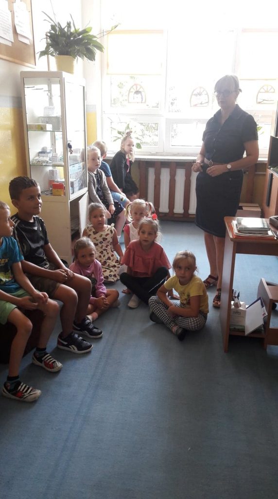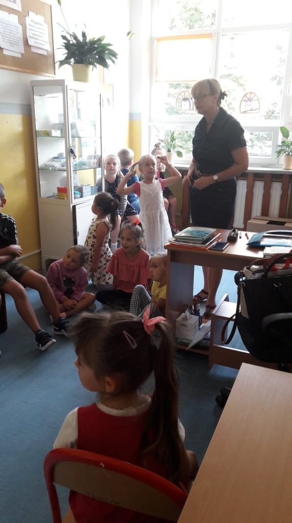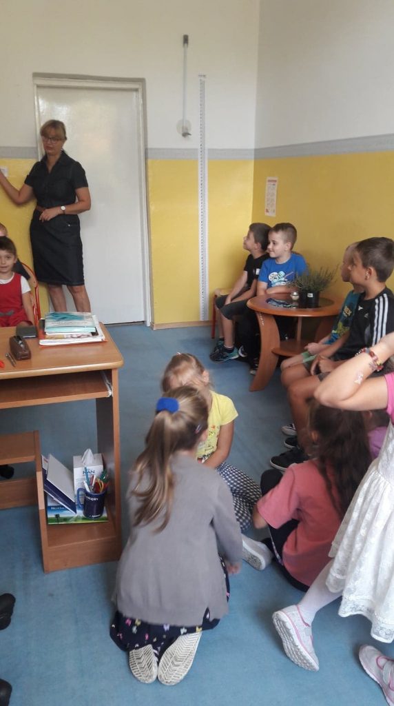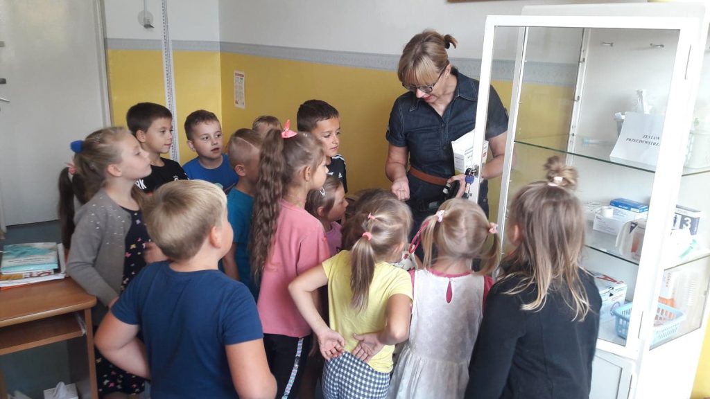 Dzieci z oddziału przedszkolnego, dzięki uprzejmości pielęgniarki szkolnej – Pani Moniki Ługowskiej, miały okazję odwiedzenia jej gabinetu. Podczas odwiedzin pani pielęgniarka zaprezentowała uczniom działanie stetoskopu, ciśnieniomierza oraz termometru, a także pokazała różne środki medyczne. Przedszkolaki z dużym zainteresowaniem wysłuchały pogadanki, dzięki której mogły więcej dowiedzieć się o trudnym zawodzie pielęgniarki.