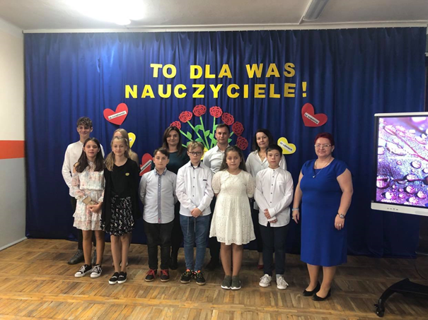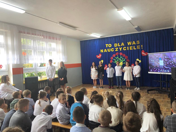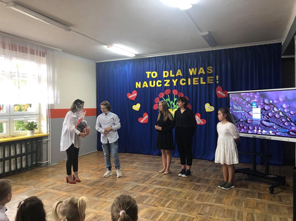 Na początku uczniowie klasy VI zaśpiewali trzy piosenki związane ze świętem nauczyciela, pracą nauczyciela i śpiewająco podziękowali nauczycielom za ich trud i troskę. W rolę konferansjerów wcielili się zaś uczniowie klasy VIII. Następnie dla uczniów została przygotowana niespodzianka tj. prezentacja zdjęć nauczycieli z lat ich dzieciństwa a uczniowie odgadywali, kto się krył za danym zdjęciem. Nauczyciele otrzymali również od uczniów imienne dyplomy z osobistą dedykacją. Całość uświetniła piękna dekoracja, przygotowana na tę szczególną okazję. Nie zabrakło również podziękowań dla pani Dyrektor Marzeny Sadzy i Grona Pedagogicznego od Samorządu Uczniowskiego wraz z jego opiekunem panem Michałem Mindą. Na tym nie koniec, ponieważ kolejne zajęcia prowadzili nie nauczyciele, ale chętni uczniowie. Jeszcze raz najlepsze życzenia dla Grona Pedagogicznego.