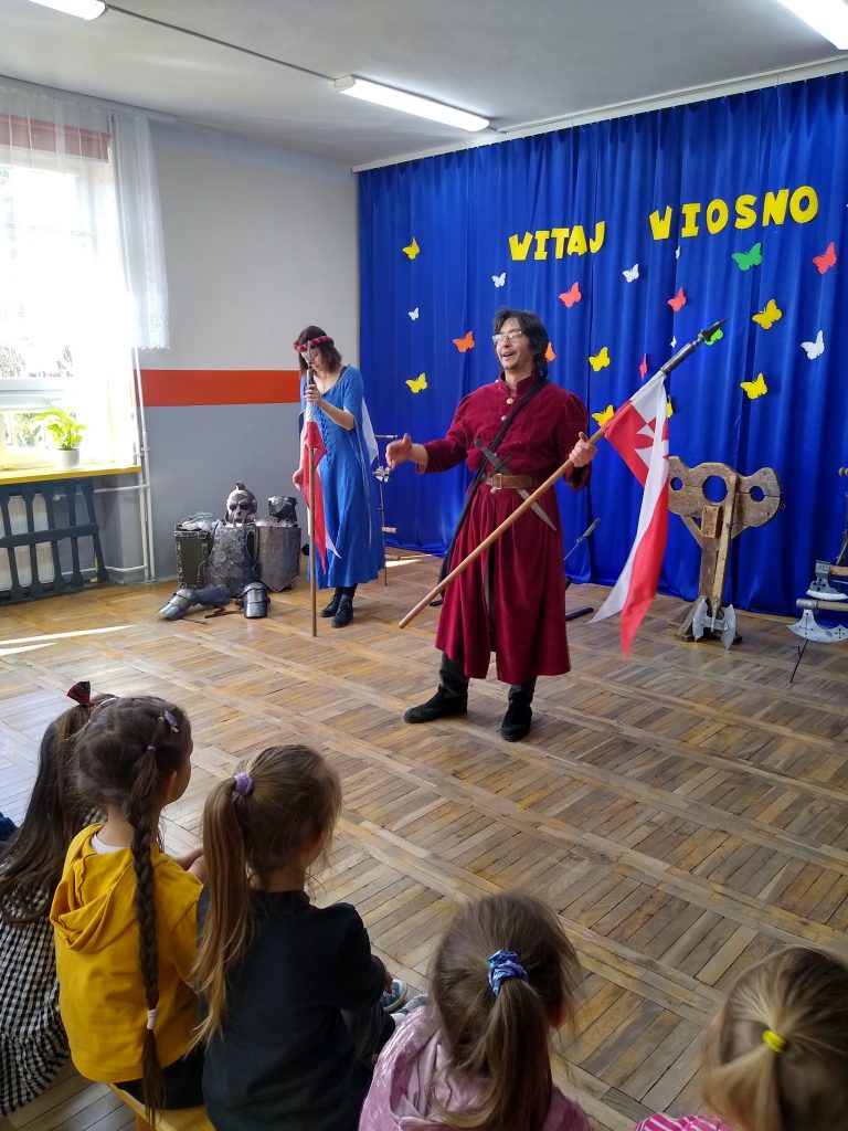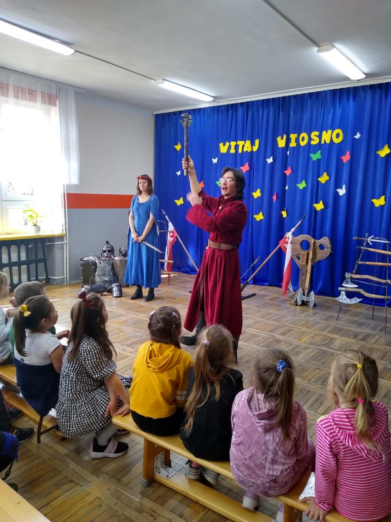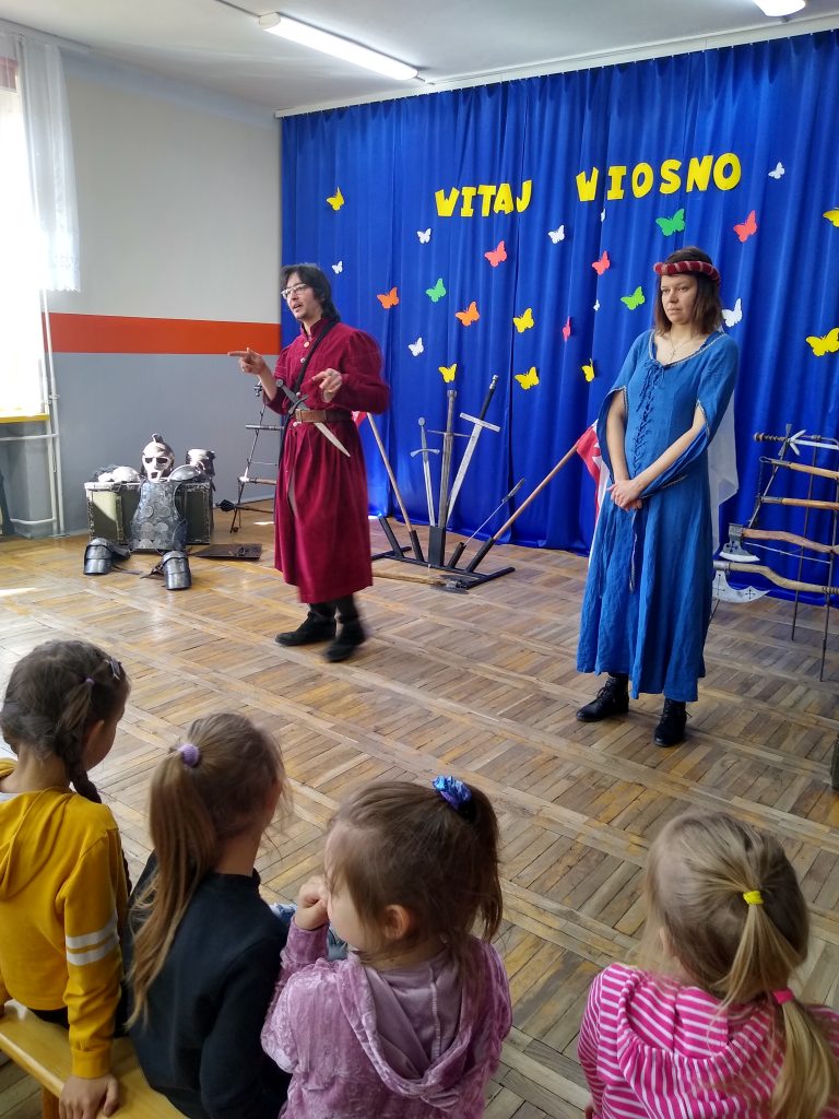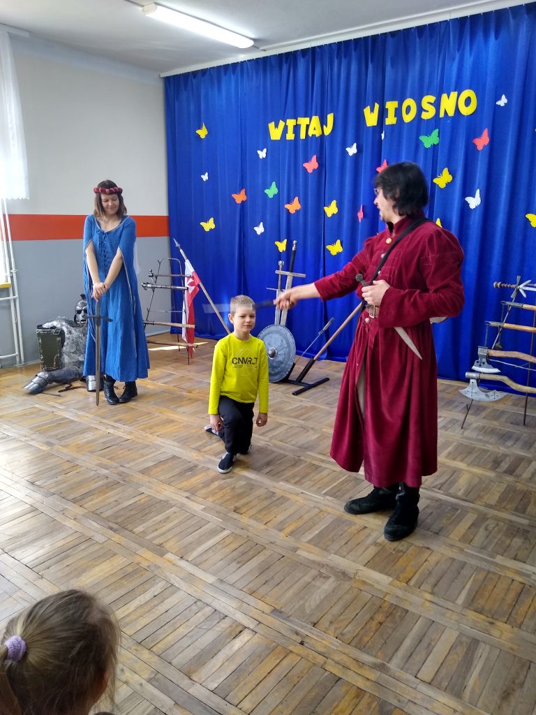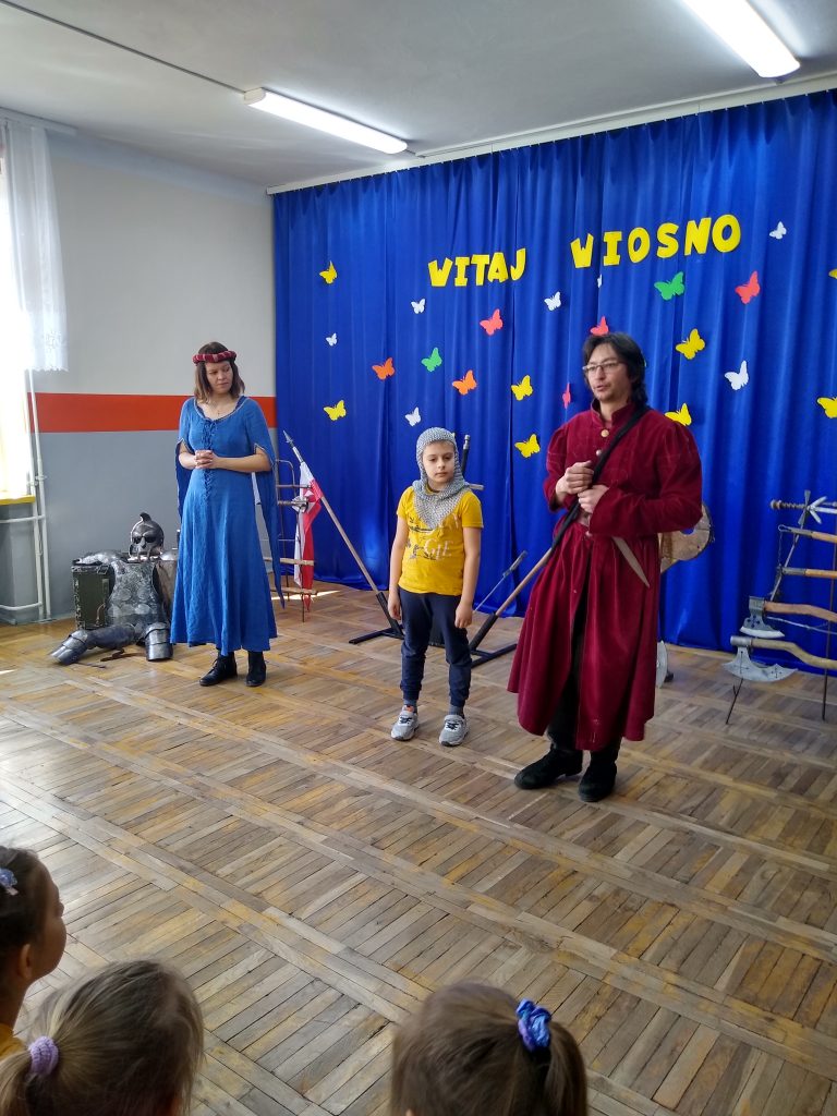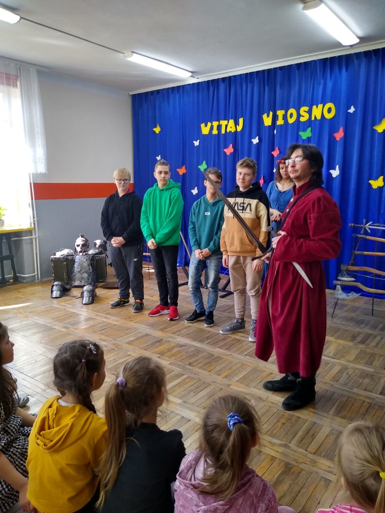 Można było obejrzeć ekwipunek i uzbrojenie rycerzy oraz poznać ciekawostki związane z obyczajami i kulturą epoki. Uczniowie chętnie zgłaszali się do pomocy i prezentacji. Każdy mógł osobiście zapoznać się ze strojem i rekwizytami.