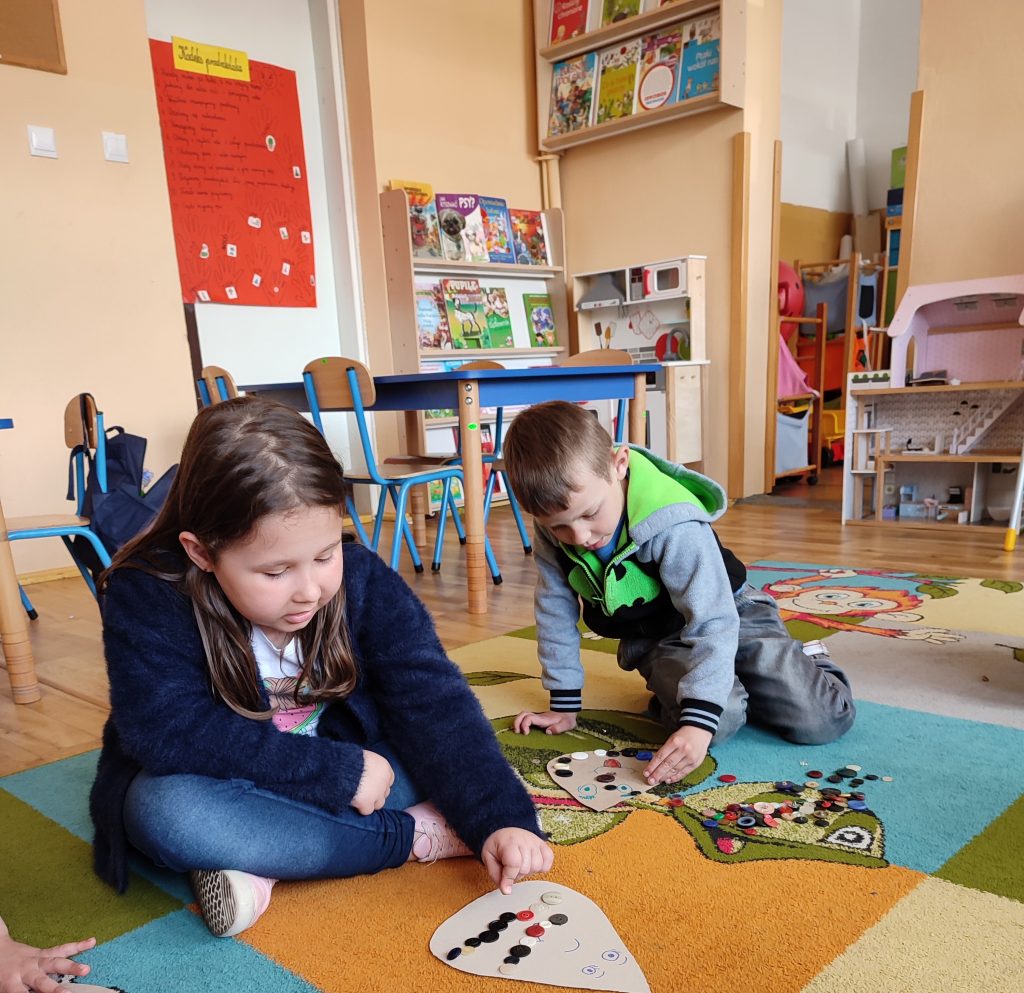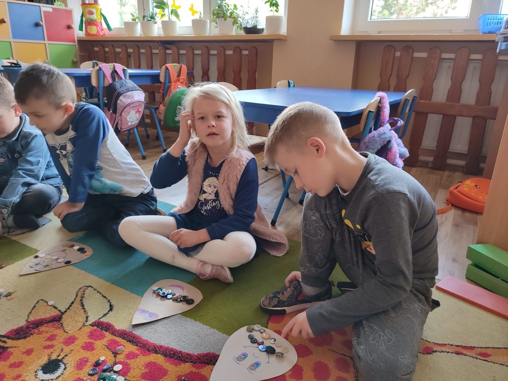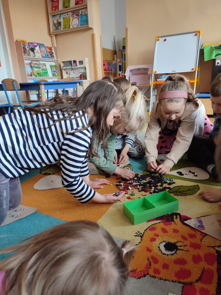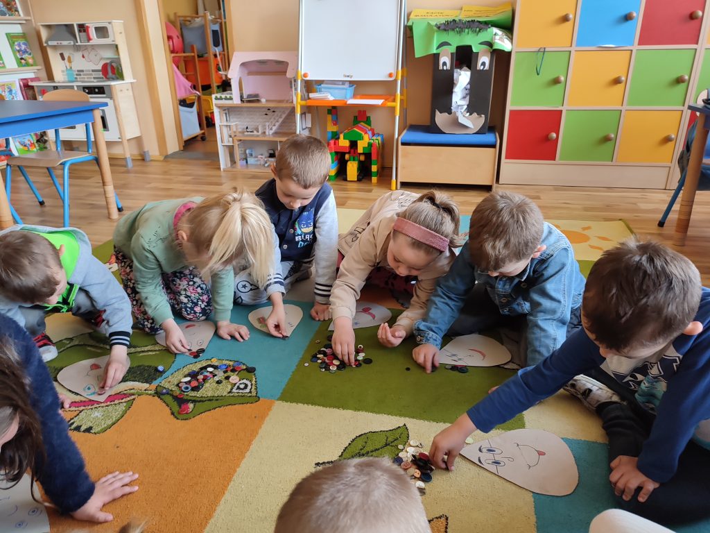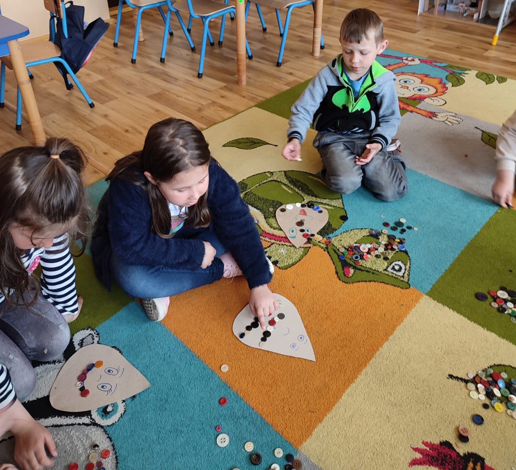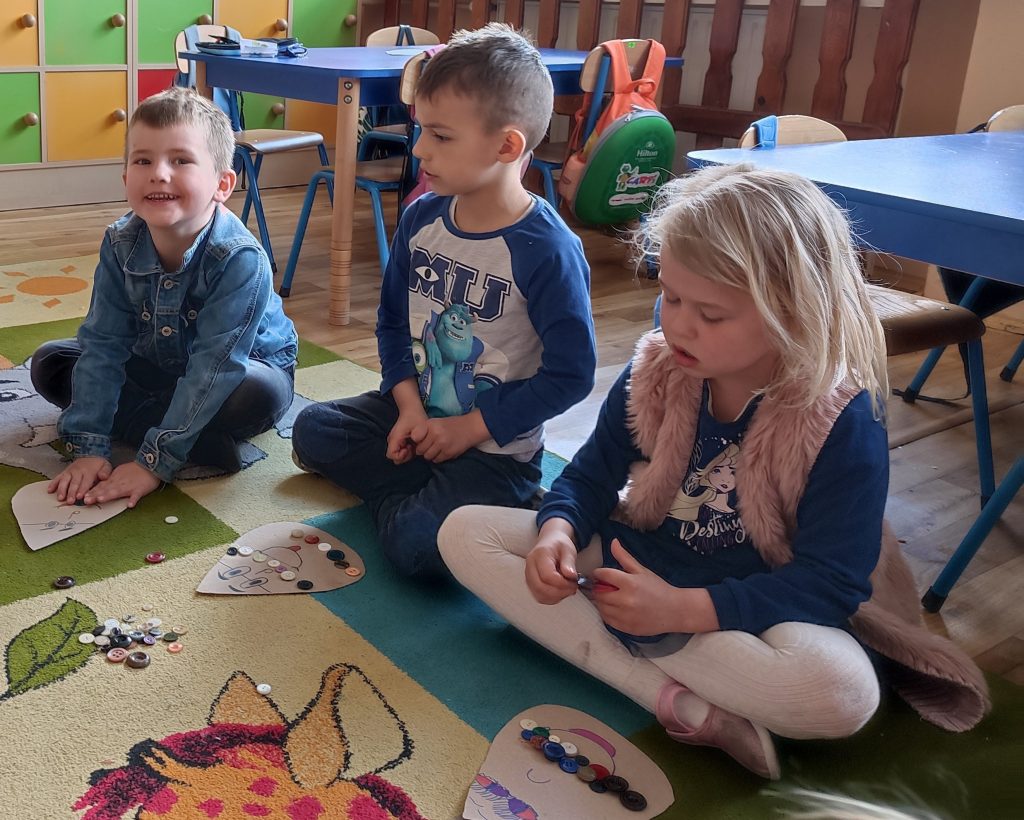 Razem z „Matematyczną kropelką” doskonaliliśmy umiejętność dodawania i odejmowania. Dużo radości sprawiła dzieciom możliwość przeliczania kolorowych guzików. Nasze działania odbywały się również w toalecie, gdzie przypomnieliśmy sobie zasady prawidłowego mycia rąk.