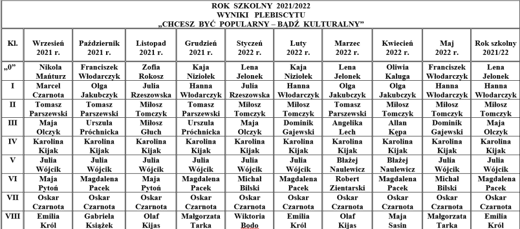 Podsumowanie plebiscytu – wyniki klasowe 19 czerwca, 2022 | Brak komentarzy Zakończyliśmy klasowy etap plebiscyt “Chcesz być popularny – bądź kulturalny.” Oto wyniki: Post Views: 143