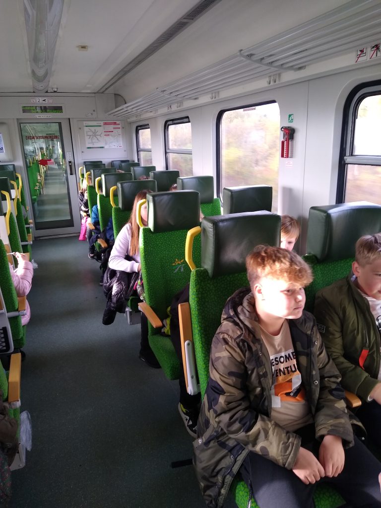 Później wszyscy udali się na dworzec PKP. Po kilku minutach oczekiwania uczniowie zajęli miejsca w wagonie i po raz kolejny podziwiali jesienny krajobraz za oknem. Uśmiechnięci i zadowoleni wysiedli na stacji Szydłowiec i udali się w kierunku szkoły.