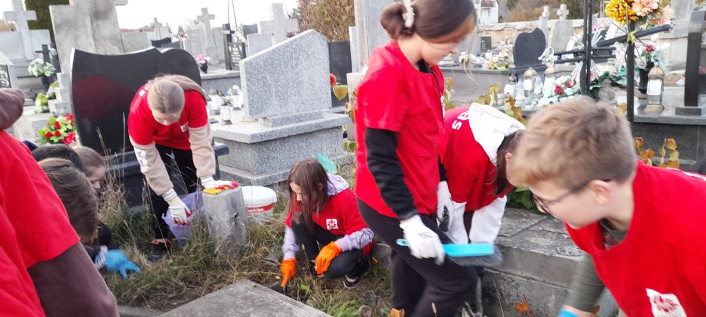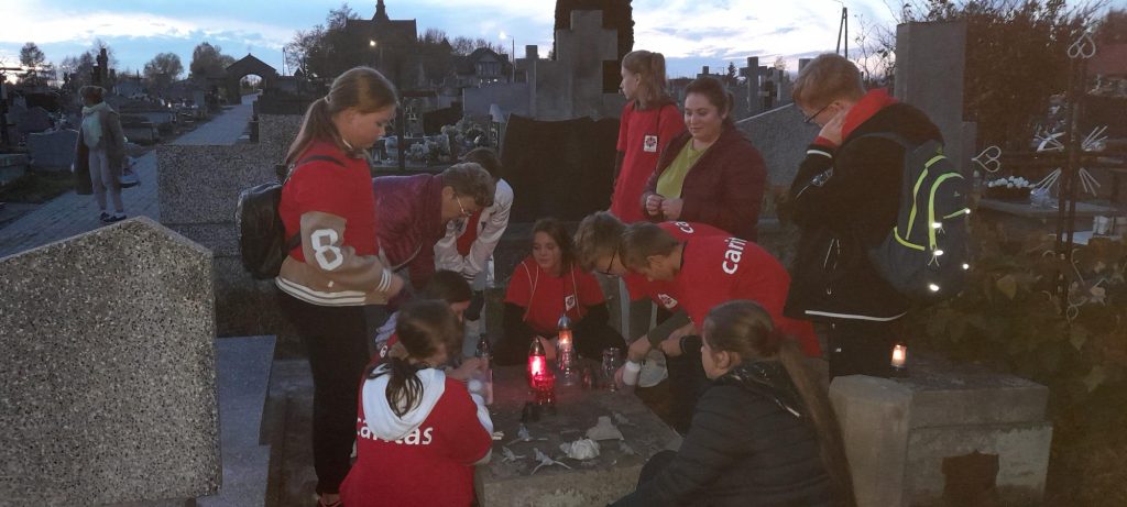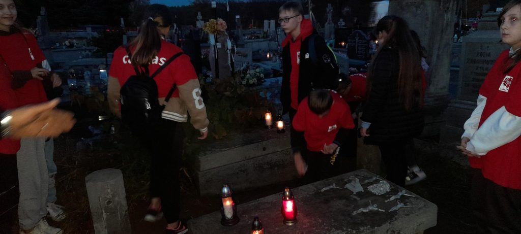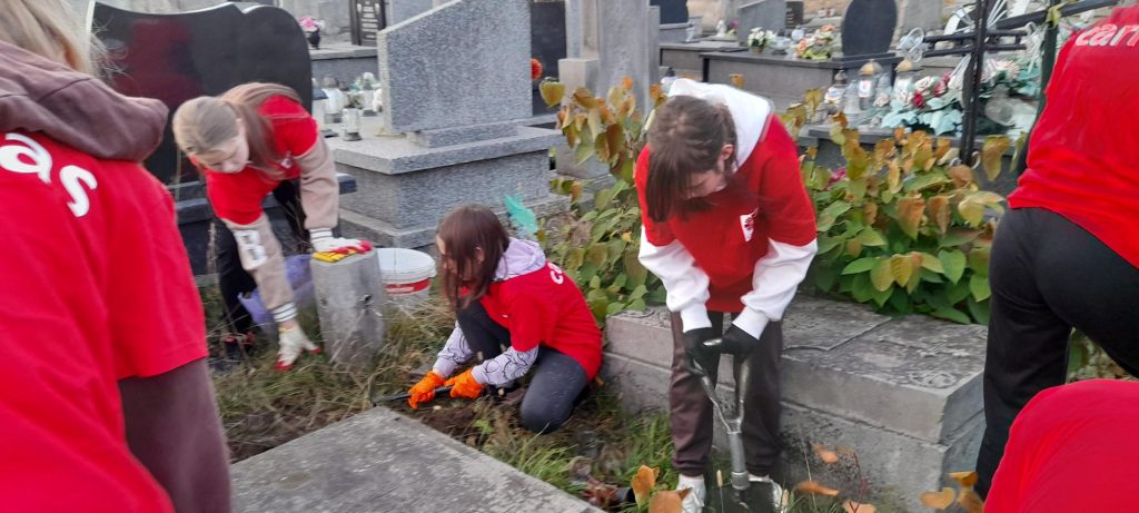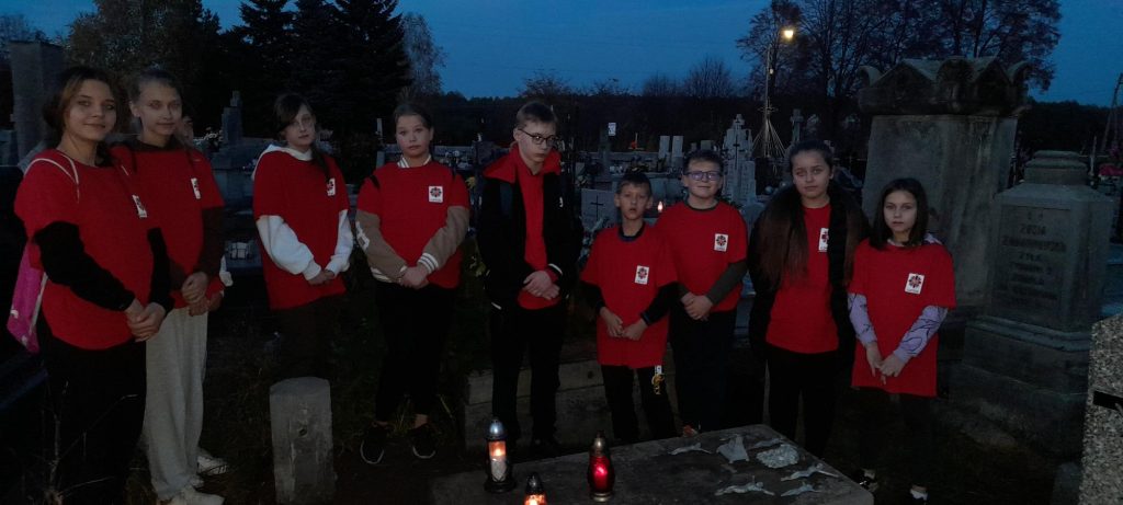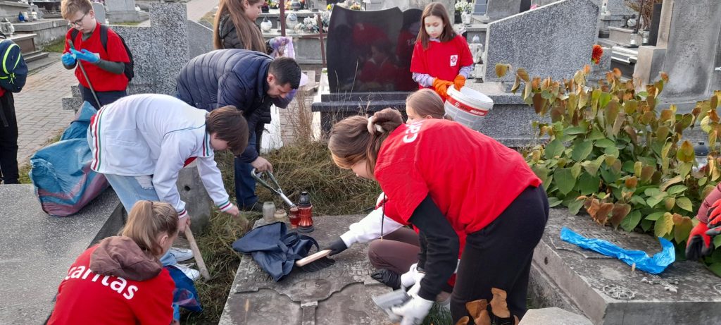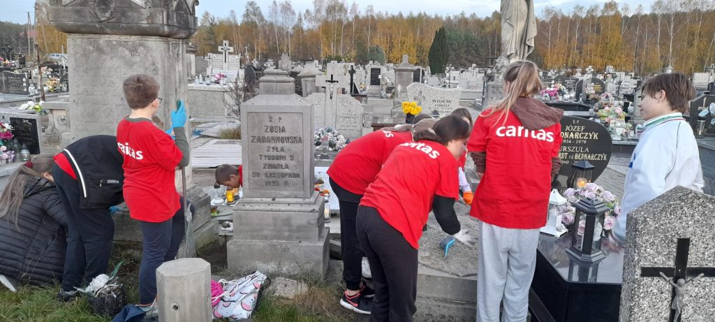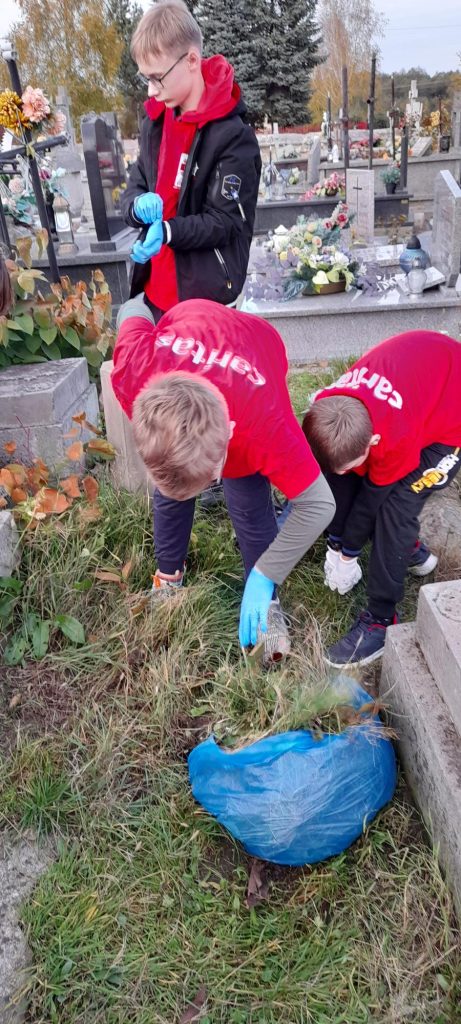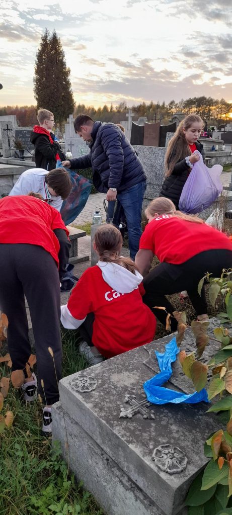 24 października 2022 roku w godzinach popołudniowych wolontariusze SKC spotkali się na cmentarzu parafialnym w Jastrzębiu w celu uporządkowania zaniedbanych grobów. Przynieśli worki, rękawice, narzędzia ogrodnicze i znicze. Wykazali się zaangażowaniem i pracowitością przy zgrabianiu liści, wyrywaniu trawy i chwastów. Radością napawa fakt, że potraktowali wolne popołudnie na sprzątanie cmentarza jako lekcję szacunku i pamięci o przodkach. Akcja zakończyła się zapaleniem zniczy na uporządkowanych grobach oraz modlitwą za zmarłych.
