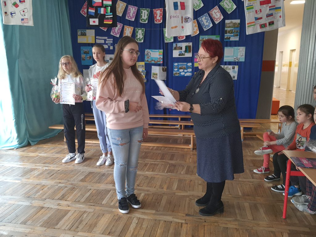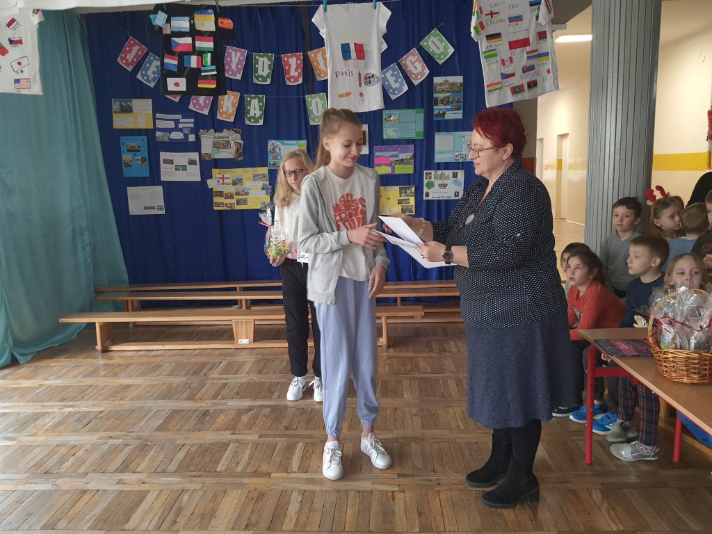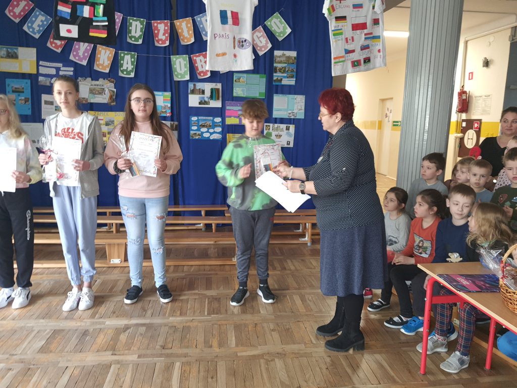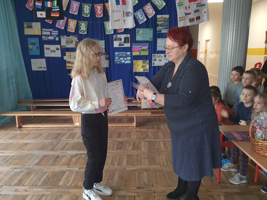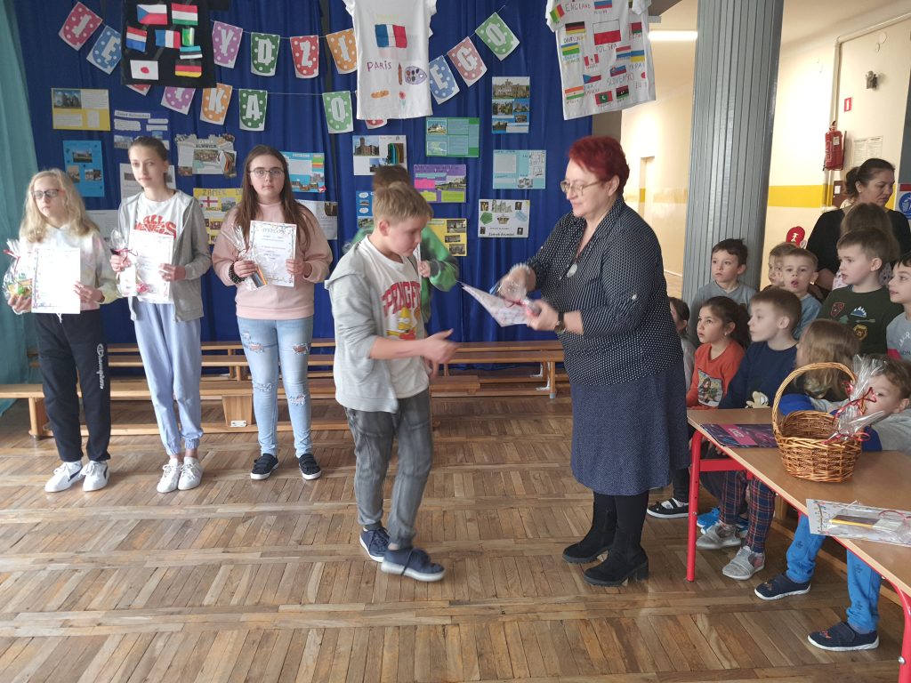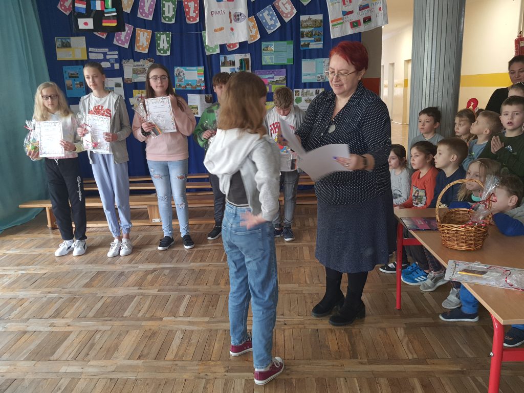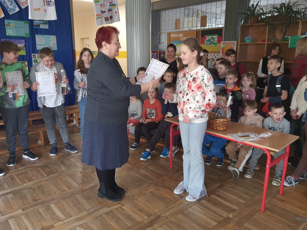 31 marca 2023r. 9 zwycięzców konkursu na forum szkoły otrzymało dyplomy oraz nagrody rzeczowe ufundowane przez organizatora konkursu – panią Ninę Pytoń.