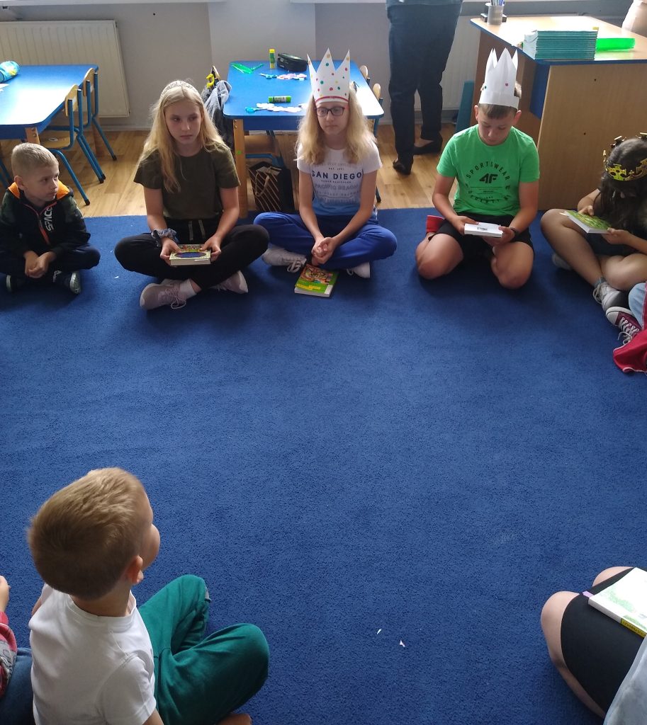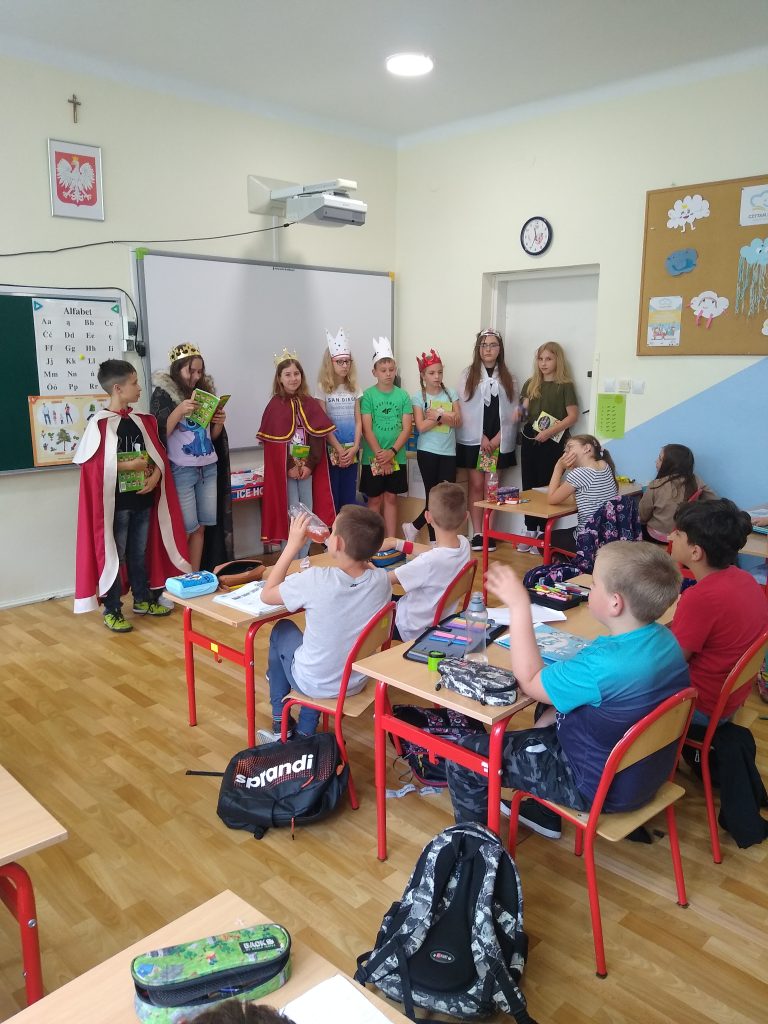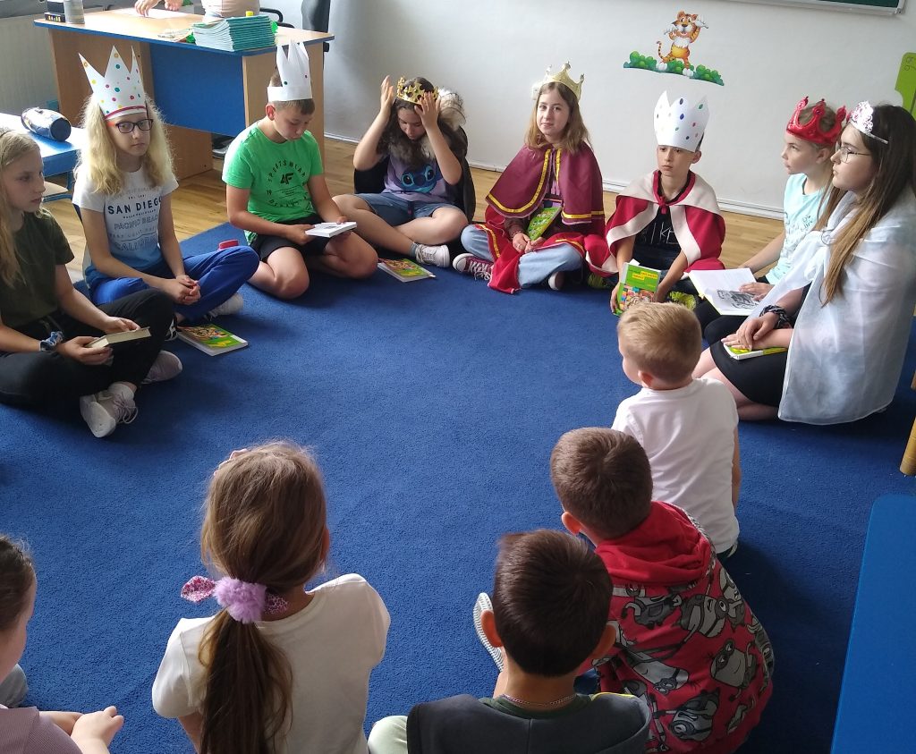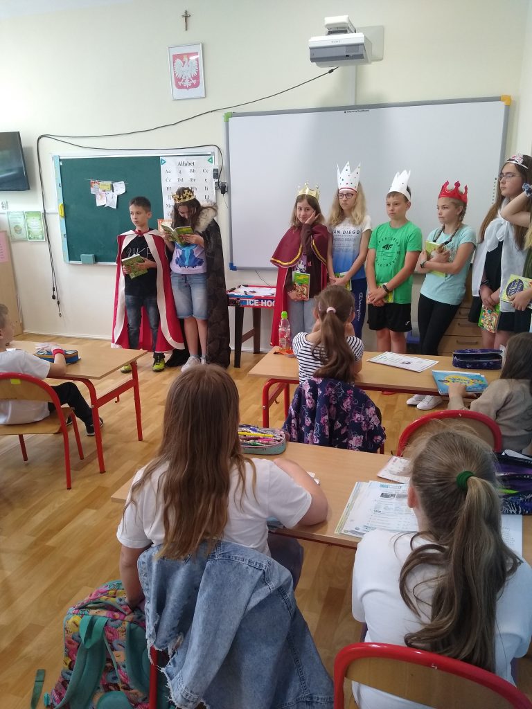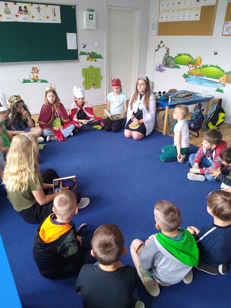Uczniowie odwiedzili dzieci z oddziału przedszkolnego oraz z klas I i II. We wspaniałych koronach na głowach i królewskich płaszczach odczytali swoim młodszym koleżankom i kolegom wybrane fragmenty powieści Janusza Korczaka. Tym samym krótko przedstawili postać króla Maciusia i część jego przygód oraz zaciekawili książką najmłodszych. Można mieć nadzieję, że i oni wkrótce odwiedzą szkolną bibliotekę, by wypożyczyć powieść Janusza Korczaka.