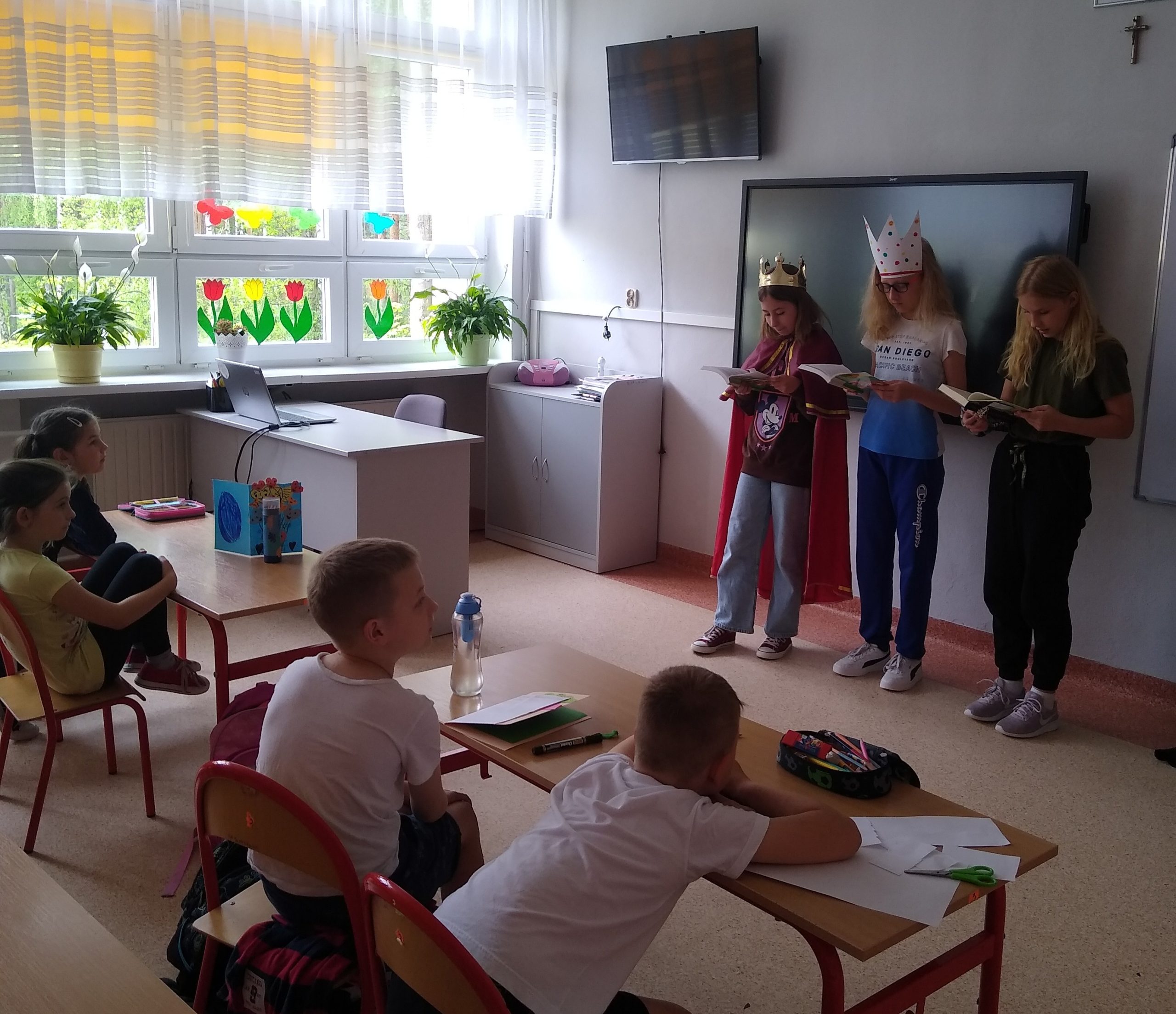Uczniowie odwiedzili dzieci z oddziału przedszkolnego oraz z klas I i II. We wspaniałych koronach na głowach i królewskich płaszczach odczytali swoim młodszym koleżankom i kolegom wybrane fragmenty powieści Janusza Korczaka. Tym samym krótko przedstawili postać króla Maciusia i część jego przygód oraz zaciekawili książką najmłodszych. Można mieć nadzieję, że i oni wkrótce odwiedzą szkolną bibliotekę, by wypożyczyć powieść Janusza Korczaka.