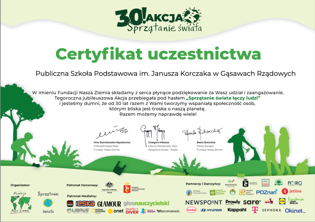 Tegoroczne sprzątanie przebiegało pod hasłem „Sprzątanie świata łączy ludzi” i w trzeci weekend września, uczniowie naszej szkoły wyszli, by oczyścić swoje najbliższe otoczenie z porzuconych w naturze śmieci. Szkolni koordynatorzy tegorocznej akcji panie: Adrianna Sadza i Emilia Siudak przesłały sprawozdanie z ilości zebranych śmieci do fundacji Nasza Ziemia, a w zamian za zaangażowani w akcję szkoła otrzymała certyfikat uczestnictwa.