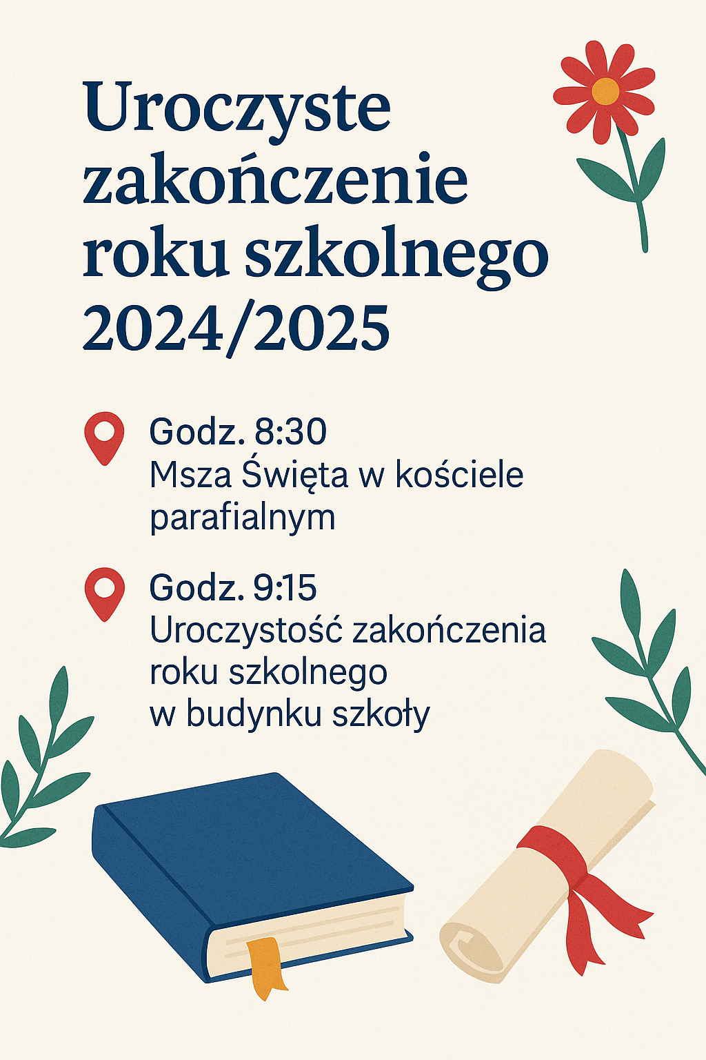 Szanowni Rodzice, Drodzy Uczniowie! Zbliża się czas podsumowania wspólnie przeżytego roku szkolnego. Uroczyste zakończenie roku odbędzie się w piątek, 27 czerwca 2025 r. 📍 Godz. 8:30 – Msza…