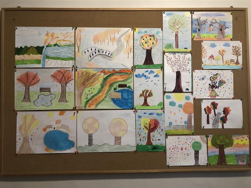 Prace plastyczne uczniów klas 4-7 pt: ,, Jesienny pejzaż”wykonane pod kierunkiem pani Niny Pytoń na zajęciach plastyki.